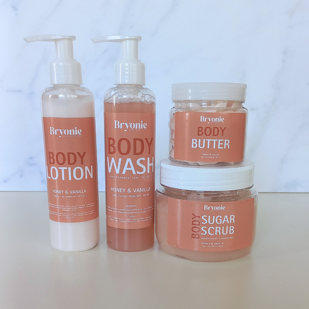 Body wash(gel douche naturel), Body sugar scrub(gommage exfoliant corporel), Body lotion(lotion corporelle hydratante), Body butter (beurre corporel nourissant).