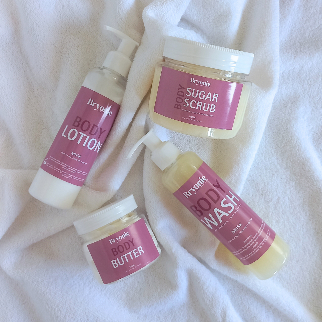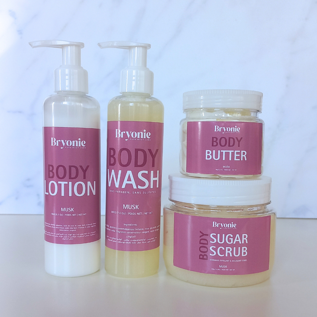 Body wash(gel douche naturel), Body sugar scrub(gommage exfoliant corporel), Body lotion(lotion corporelle hydratante), Body butter (beurre corporel nourrissant).